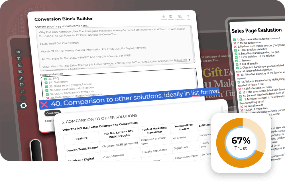 Gyengék a landingjeiden a bizalmi blokkok, vagy esetleg teljesen hiányoznak? A Konverziós Blokk Építő 46 különböző bizalmi blokkot ellenőriz és képes legyártani percek alatt! Ezek a tartalmi blokkok bevált pszichológiai triggereken alapulnak, amelyek garantáltan segítik a konverziót.