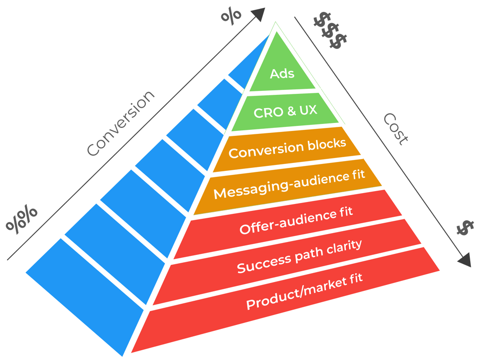A hagyományos megközelítés nem működik, mert a legtöbb konverzióoptimalizálási módszer csak kozmetikázás: segítenek kicsit javítani a konverziót anélkül, hogy az alapvető problémákat megoldanák, miközben már égeted a pénzt a hirdetésekkel…